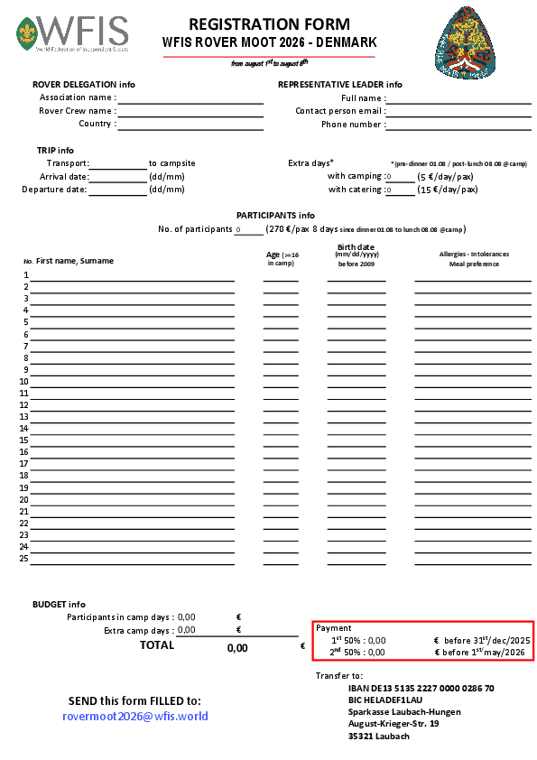 2026 is the year in which the first WFIS World Rover scout Moot will take place, which will be held in Denmark at the same campsite where the first WFIS World Jamboree was held and will take place between August 1st and August 8th, 2026. You have the possibility of camping before and after this date.